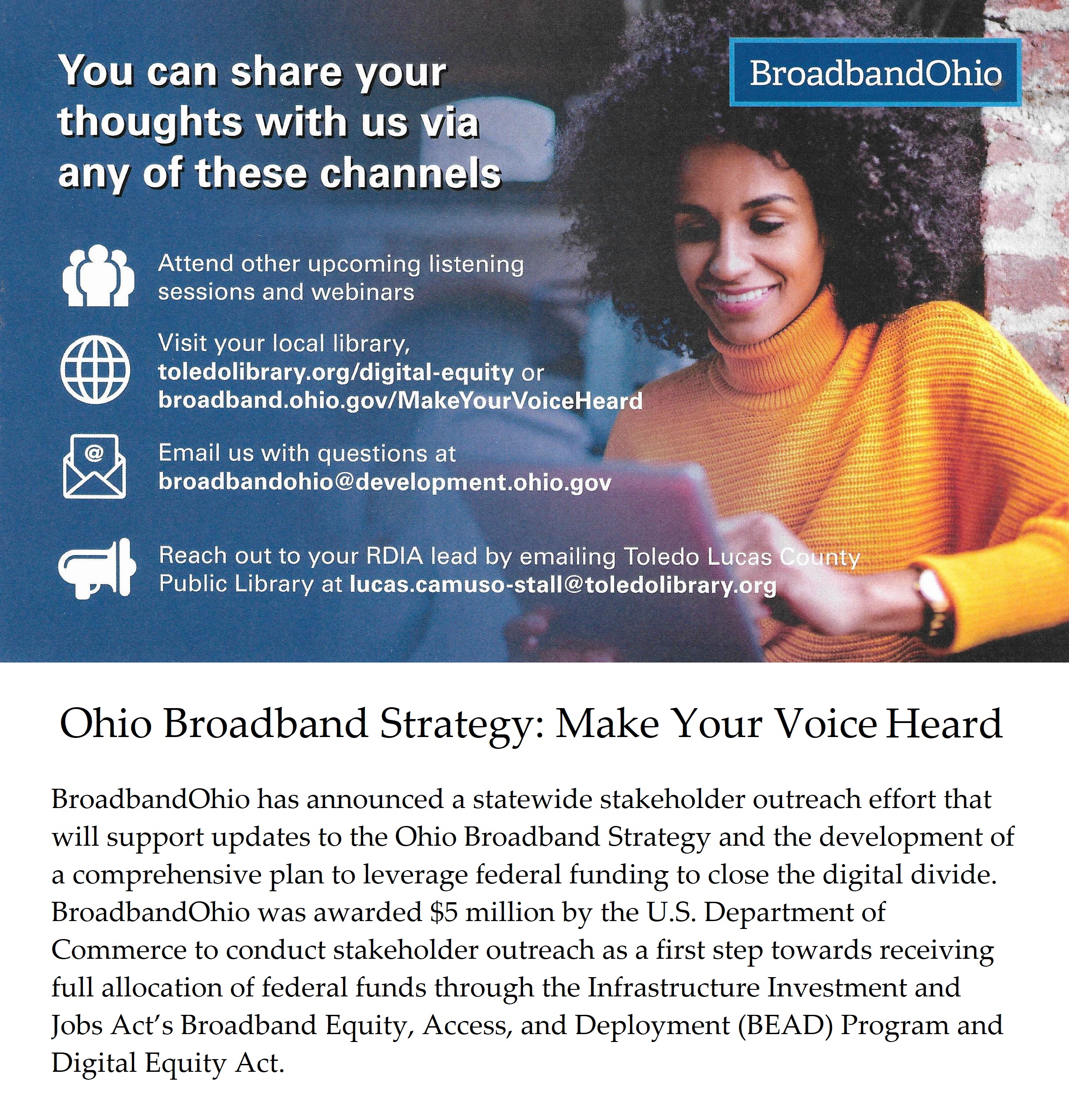 BroadbandOhio was awarded $5 million by the U.S. Department of Commerce to conduct stakeholder outreach as a first step towards receiving full allocation of federal funds through the Infrastructure Investment and Jobs Act’s Broadband Equity, Access, and Deployment (BEAD) Program and Digital Equity Act.